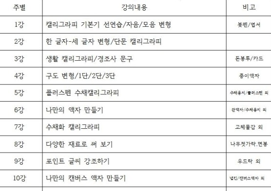 주제는 성인을 대상으로 한 캘리그라피이며, 4월 15일부터 6월 17일까지 총 10회 진행됩니다.