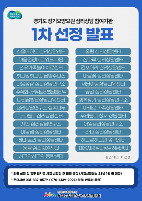 지난 2022년 12월 29일 경기도장기요양요원지원센터의 경기도 장기요양요원 심리상담 참여기관 모집에 구리시에서는 저희 산마루심리상담센터가 1차 선정되었습니다.