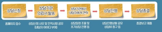 장기요양요원 여러분께서 심리상담서비스 지원을 받고자 하실때는 아래의 지원절차를 확인하신 후 경기도장기요양지원센터 홈페이지(경기도장기요양요원지원센터 (ggscw.or.kr)에서 신청하시거나 저희 센터로 전화(031-572-0715) 문의주시기 바랍니다.