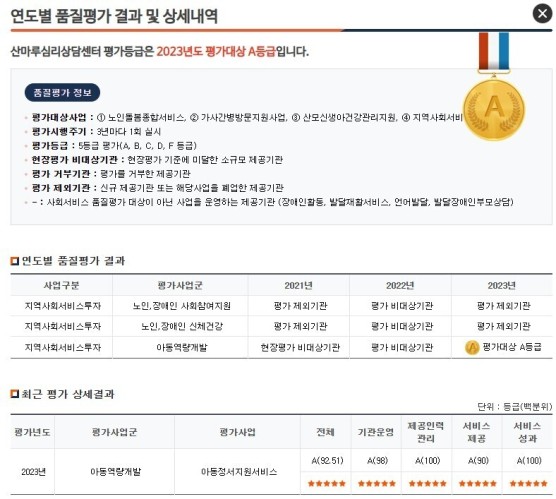 2023년 사회서비스 품질평가 결과 A등급을 받았습니다.